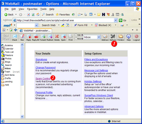| 1)Click the 'Options' button, this will open a new screen displaying all the settings that can be modified in Webmail. |